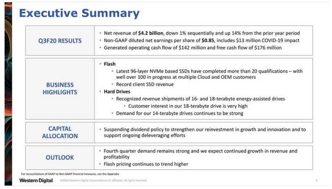 考虑到笔记本电脑和云计算的增长,人们可以预计西部数据会有不错的表现。不出所料,该公司在艰难的环境下表现很好。西部数据2020财年第三季度营收同比增长14%。在这种艰难的商业环境下,该公司实现了1.42亿美元的运营现金流和1.76亿美元的自由现金流。受笔记本电脑需求强劲的推动,该公司的客户端设备市场对其SSD驱动器的需求强劲,西部数据能够以更高的价格出售这些产品。