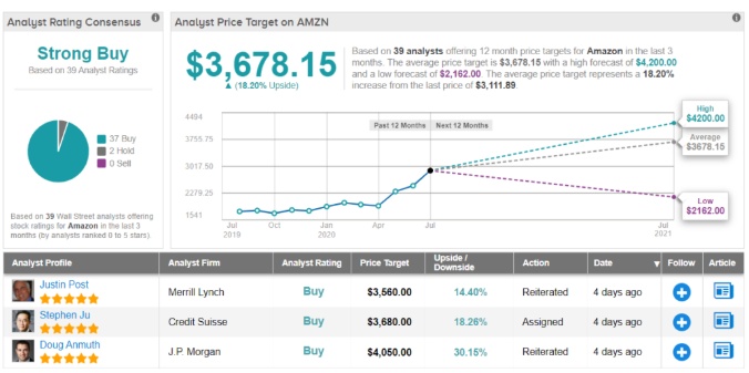 这家电子商务巨头几乎得到了分析师的一致支持。华尔街分析师中,37位予以“买入”评级,2位予以“持有”评级,为强烈的“买入”共识评级。未来12个月平均目标价为3678.15美元,预计涨幅达17%。