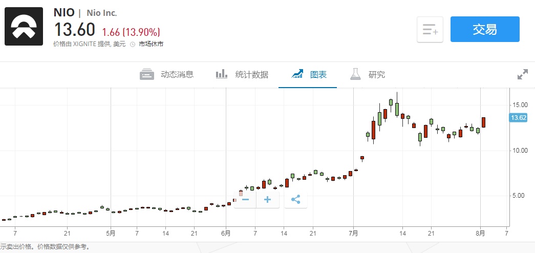 智通财经APP获悉,8月4日美股盘前,蔚来(NIO.US)股价继续上涨,截止北京时间16:48,涨4.26%,报14.18美元。
