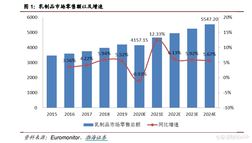 不过,随着国内消费者的消费观念逐渐转变、消费习惯逐渐培养,我国乳制品行业规模还将有望继续增长。据欧睿预测,未来五年我国乳制品市场仍然将稳步发展,至2024年乳制品市场零售额或将突破5500亿元。