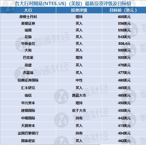 二、各大行对网易(NTES.US)(美股)最新投资评级及目标价