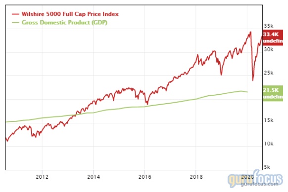 智通财经APP获悉,周一,伯克希尔哈撒韦公司首席执行官沃伦•巴菲特最喜欢的市场指标超过了155%,接近历史最高水平,这得益于几家大型科技公司在强劲二季度盈利之下继续走高。