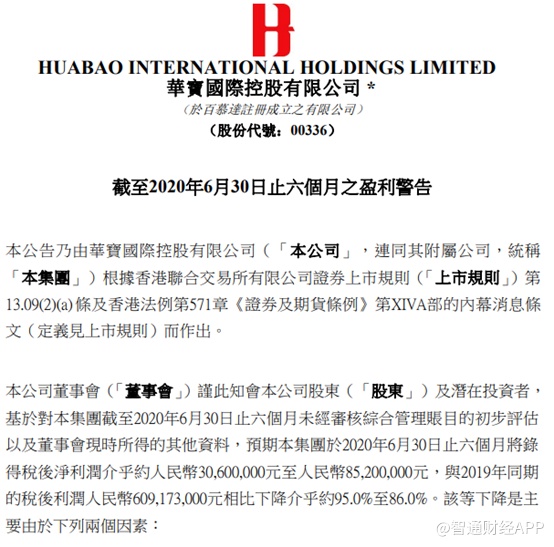 早前,华宝国际发盈警,预期公司2020上半年将录得税后净利润介乎约人民币3060万元至8520万元,与2019年同期的税后利润6.09亿元相比下降介乎约95.0%至86.0%。