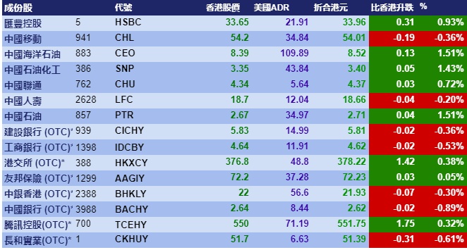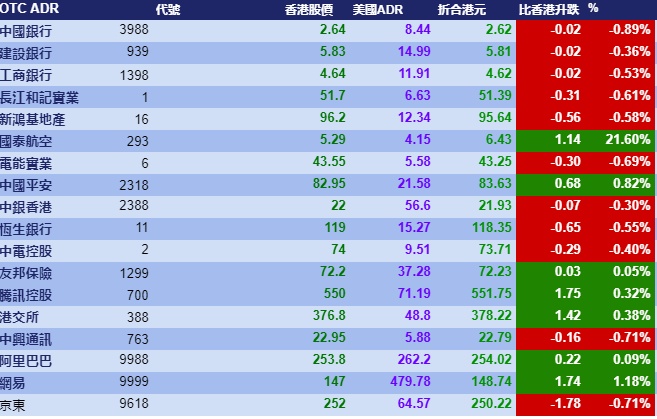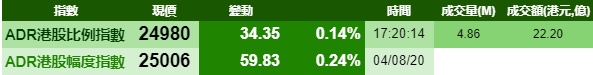 智通财经APP获悉,周二美股收市上涨,刺激港股ADR指数全日靠稳,按比例计算,收报24980点,升34.35点或0.14%。