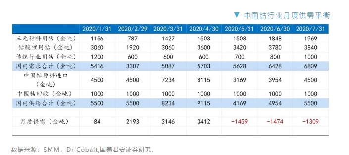 即使加上1000吨左右的回收供给,5-7月每个月的钴供需短缺仍有20%左右,预测产业链内钴原料以及钴盐库存将会进一步快速去化。