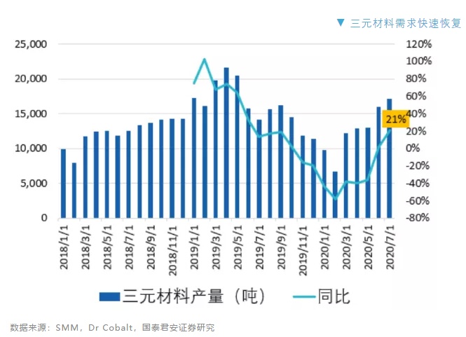 动力电池方面,中国1-5月份,三元正极材料产量同比下滑20-58%,但是从6月份开始,同比数据恢复正增长,预计7月三元材料产量同比增加21%。