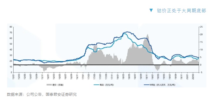 但整体来看,钴过去一轮大周期处于20-80万/吨的价格范围,我们认为目前钴价仍在底部,仍处于上涨的前期,未来空间巨大。
