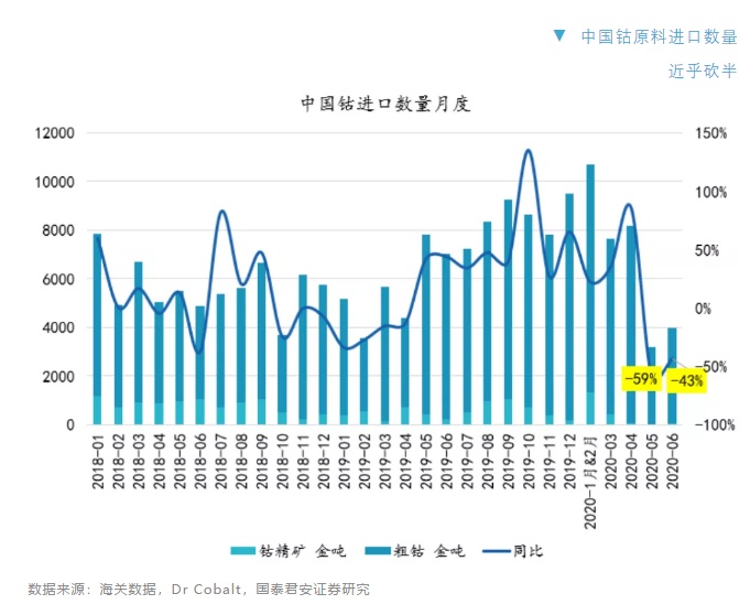 目前南非确诊人数超50万(占比南非总人数1%),南非德班港在3月26日-4月底封港,使得中国5-6月份钴原料进口同比下滑40-50%之多。