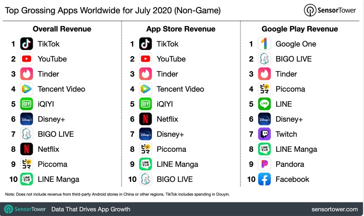 需要注意的是,Sensor Tower估计的收入来自App Store和谷歌Play在2019年7月1日至2020年7月31日之间的全球用户总支出,但不包括来自第三方安卓商店的应用程序收入。