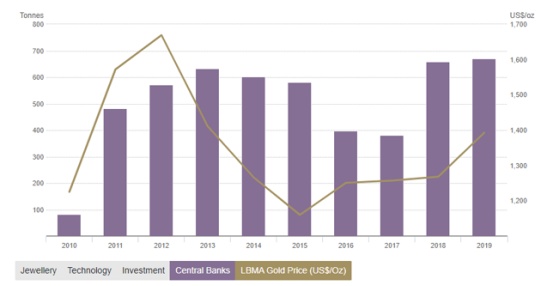 据调查,20%的央行打算在未来12个月内增加黄金储备,而在2019年调查中只有8%的受访者这样做。自2018年初以来,各国央行已向其金库增加了1200多吨黄金。