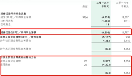经营现金流方面,伟源控股2019年已经由正转负,在手现金更是为负值。智通财经APP了解到,由于按金/预付款项、合约资产净值、贸易应付款以及应计费用/其它应付款全面大幅增加,导致公司2019年经营现金由2018年净流入1250.7万新元转为净流出453.3万新元。而且截止2019年年末公司在手现金为83.4万新元负值,其中现金等价物338.9万新元,但是银行透支了422.3万新元。