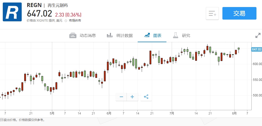 智通财经APP获悉,8月5日美股盘前,再生元制药(REGN.US)公布第二季度业绩,股价上涨,截止北京时间20:17,涨4.10%,报675美元。