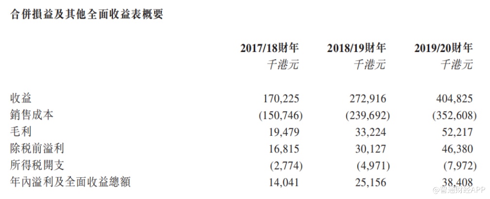 截至3月31日止的2018年、2019年和2020年三个财政年度,广联工程营收分别达到1.7 亿港元(单位下同)、2.73亿元和4.05 亿元,同期净利润分别达到1404.1万元、2515.6万元和3840.8万元。