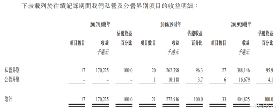 随着客户数目增加,上述财政年度期间确认收益的项目数量分别达到17个、21个及33个;期间收益贡献超过5000万港元的项目数目分别为0个、1个和3个。