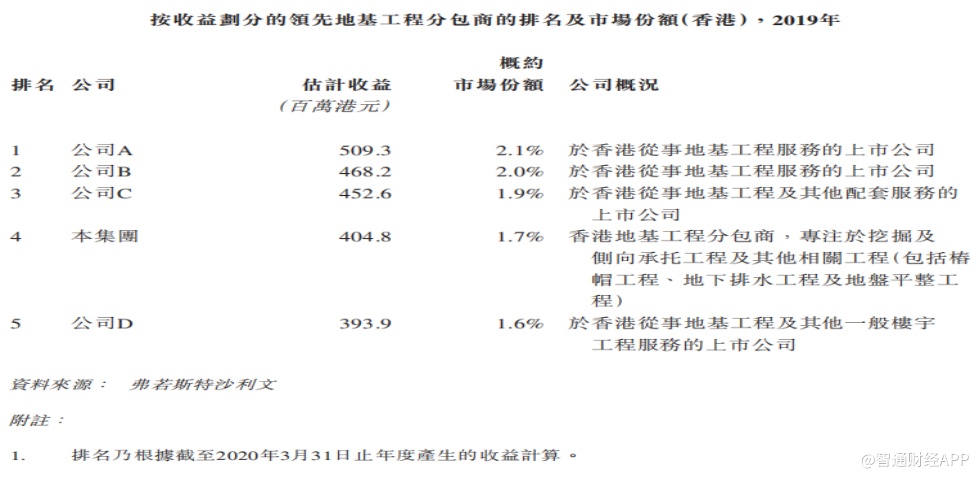 业绩成绩单逐年向好之下,广联工程的市场地位也随之改善。弗若斯特沙利文报告显示,2019年香港前5大地基工程分包商的市场份额(按收益计)为9.3%,其中广联工程位列第四,占香港地基行业约1.7%的市场份额。