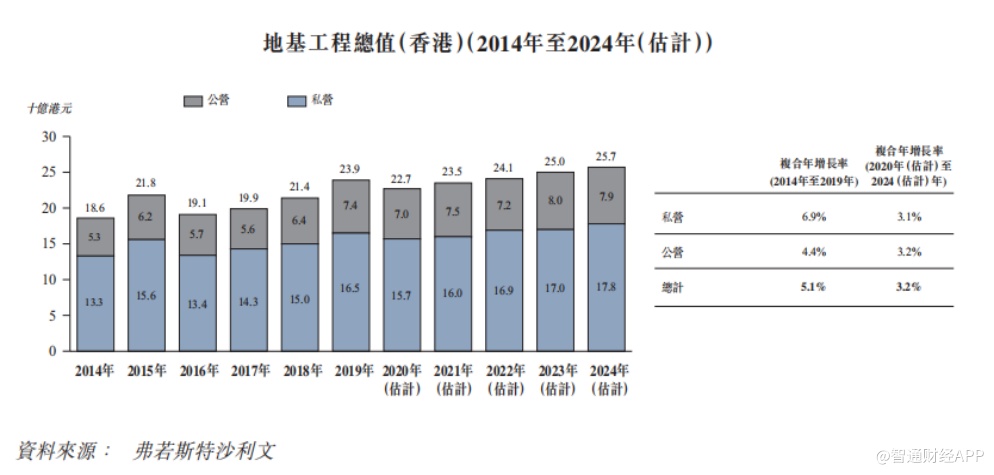 据弗若斯特沙利文报告,香港地基工程的总值由2014年的约186亿港元整体增长至2019年的239亿港元,复合年增长率约为5.1%。得益于已规划的基础设施发展项目、土地供应的增加及预计将完工的新私人住宅数量,地基工程的总值预期于未来五年以复合年增长率约3.2%增长,于2024年达约257亿港元。