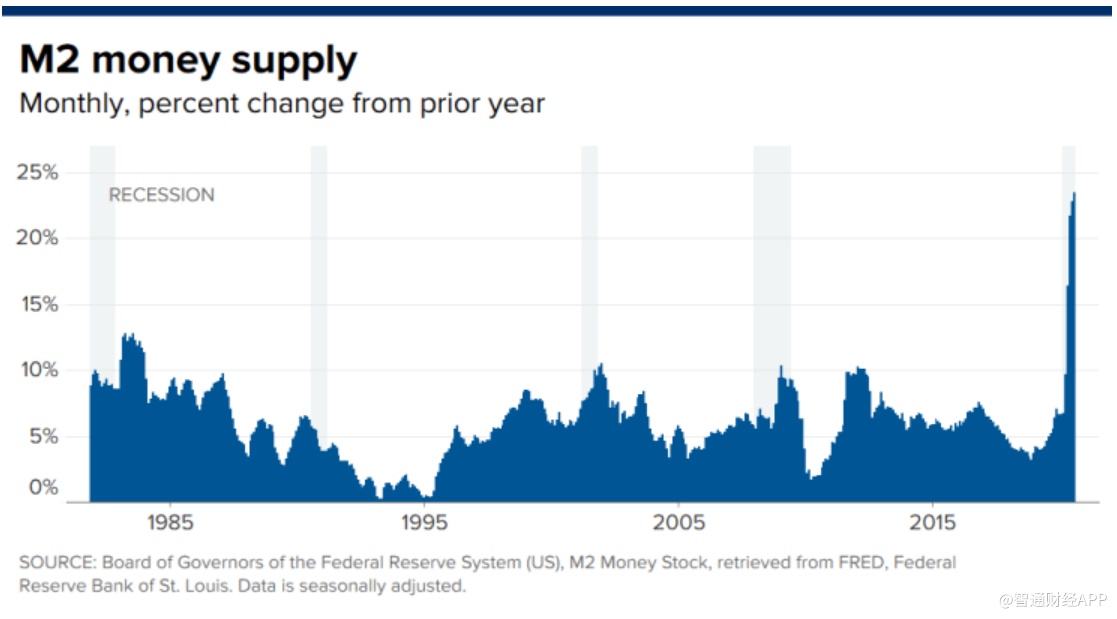 智通财经APP获悉,周三,随着美联储和美国国会将刺激措施推向新的高度,一些投资者正密切关注美国货币供应量的激增,以寻找通货膨胀的回归迹象。