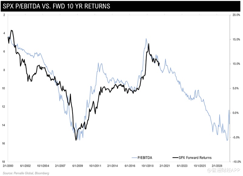 根据分析师的估值模型,由于标普500指数的价格相对于标普10年的收益流表明远期回报也将是负数,在估值的基础上能得出相同结论。而从股市相对于经济的规模来看,这也表明远期回报率将相当不理想。