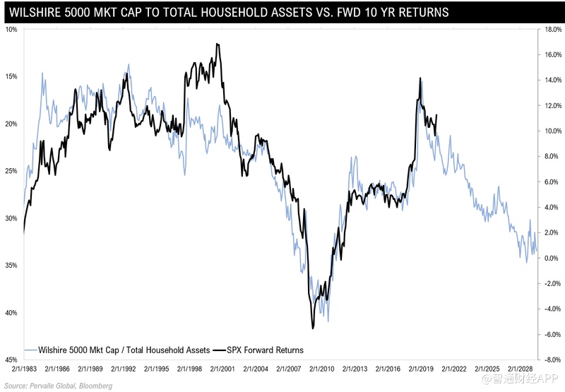 在过去10年里,威尔希尔5000指数的市值从7万亿增长到31万亿美元,相当于美国家庭总资产的40%左右。由于这么大一部分家庭财富被捆绑在股市上,为市场上涨提供动力的美元就会枯竭,导致一段时间的回报率非常低,如下图所示。