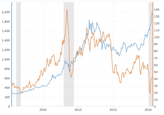 黄金与原油的价格走势(蓝线代表黄金,橙线代表原油)