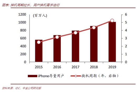 是的,我们说过去几年市场比较平淡,iPhone出货已经连续4年下滑了,全球手机市场出货也已经连续3年下滑,这也意味着换机周期拉长,等待换机的需求越来越迫切,那5G就会成为下一个推动用户换机的理由。