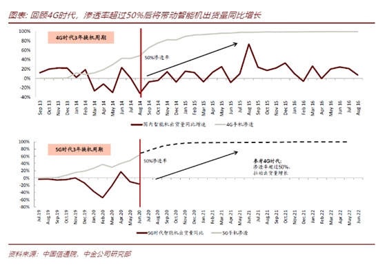 我们看到中国市场6月份5G手机渗透率已经超过60%,这个速度可以说比所有人之前的预期都要更快,我们认为超过50%才意味着换机周期真正的启动,看当年4G时代也是这样的,渗透率低于50%的时候,手机市场整体是下滑的,但是超过50%很快就回到正增长,一是因为渗透率上到一定阶段,在消费者心目中的认知和认可度会提升,第二是因为5G手机比例越来越大之后,对总量的带动效应才会越来越明显。