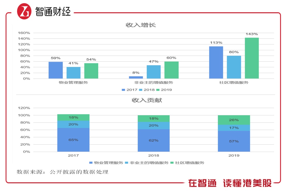 该公司的三项业务均保持了高速的成长,目前物业管理服务为核心业务,但随着战略定位转型,该项业务贡献逐年下降,而社区增值服务则逐年提升,2019年,物业管理服务和社区增值服务收入贡献分别为57%和26%。