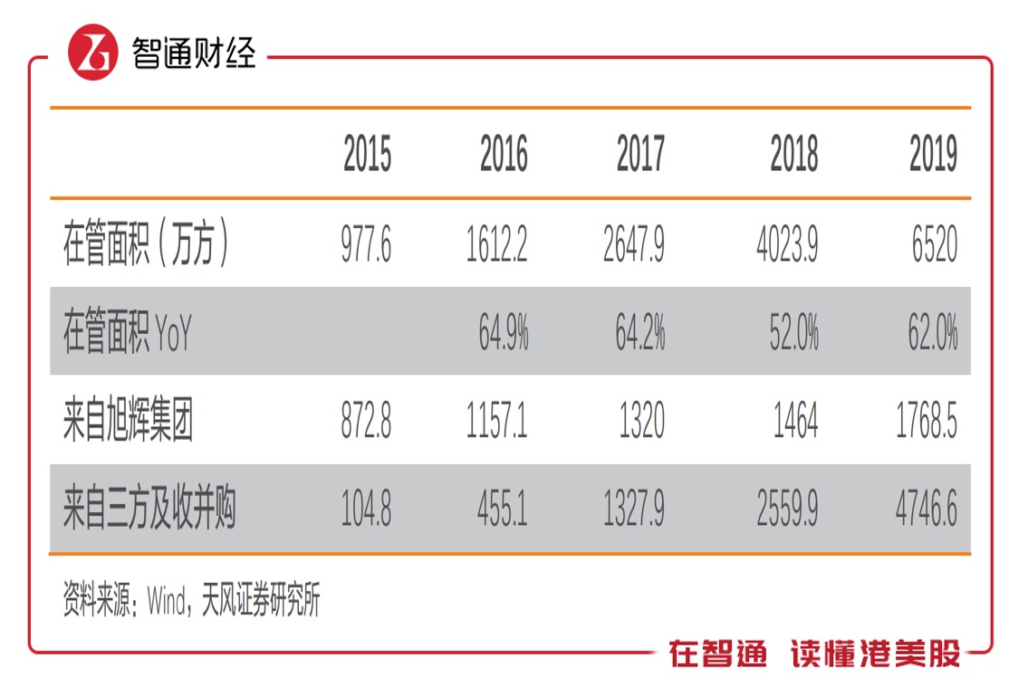 永升生活服务是由旭辉集团发家,因此物业管理服务板块对旭辉有一定的依赖度,但2018年上市后,以“关联方+招投标+战略合作+收并购”的发展战略,从第三方及收购获得快速成长,对关联方的依赖越来越小。2019年,在管面积中,来自旭辉的由2015年的89.3%下降至27.1%。