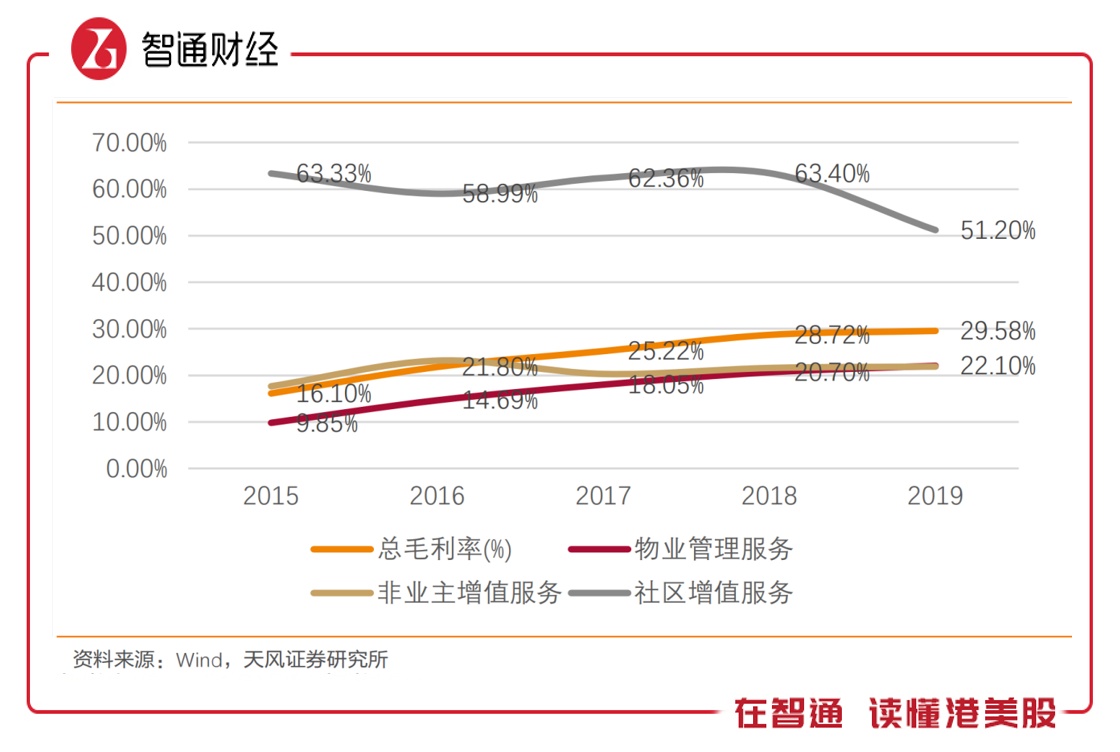 该公司于2019年毛利率为29.58%,逐年提升,主要为物业管理服务板块提毛利升以及社区增值服务板块高毛利率影响,其中社区增值服务毛利率较高,2019年毛利率高达51.2%,同比虽然下降,但毛利贡献依然增加3.91个百分点。