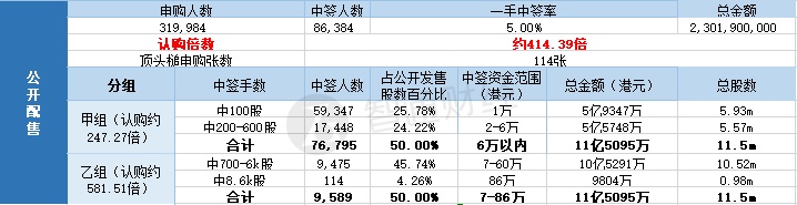 其中,公开配售申购人数319,984,一手中签率5%,认购倍数约414.39倍。