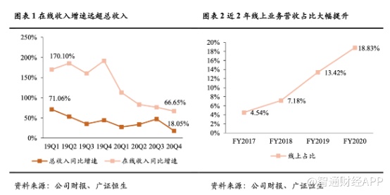 好未来近年的发展趋势可以明显体现出公司的战略走向。收入方面,公司仅用4年时间,线上营收占比从2017财年的4.54%大幅提升至2020财年的18.83%;
