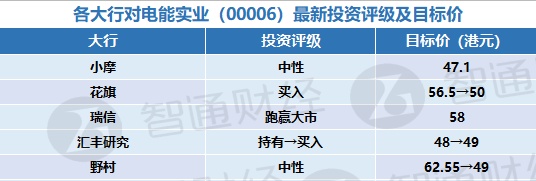 四、各大行对电能实业(00006)最新投资评级及目标价