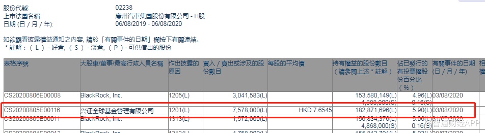 智通财经APP获悉,香港联交所最新资料显示,8月3日,兴证全球基金管理有限公司减持广汽集团(02238)757.8万股,每股作价7.6545港元,总金额约为5800.58万港元。减持后最新持股数目约为1.83亿股,最新持股比例为5.90%。