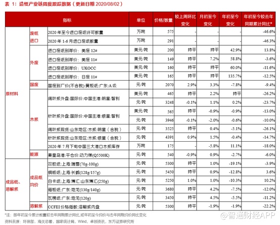 以瓦楞纸为例,wind数据显示,全国瓦楞纸市场价由年初的3547.3元/吨上涨至7月31日的3710.7元/吨,每吨价格上涨近164元。尽管瓦楞纸今年每吨价格出现较大幅度的上涨,但和去年同期相比,截至2020年6月30日,瓦楞纸价格平均下跌4.4%。7月份出现大幅度的上行,和去年同期相比,每吨价格涨幅超10%。