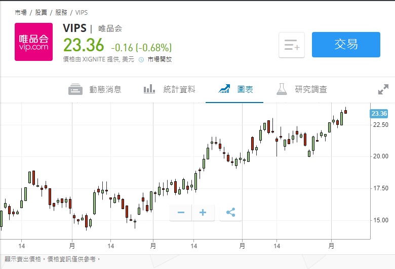 智通财经APP获悉,周四(8月6日)美股开盘,唯品会(VIPS.US)股价创2016年以来新高,截至北京时间21:39,涨0.87%,报23.725美元。