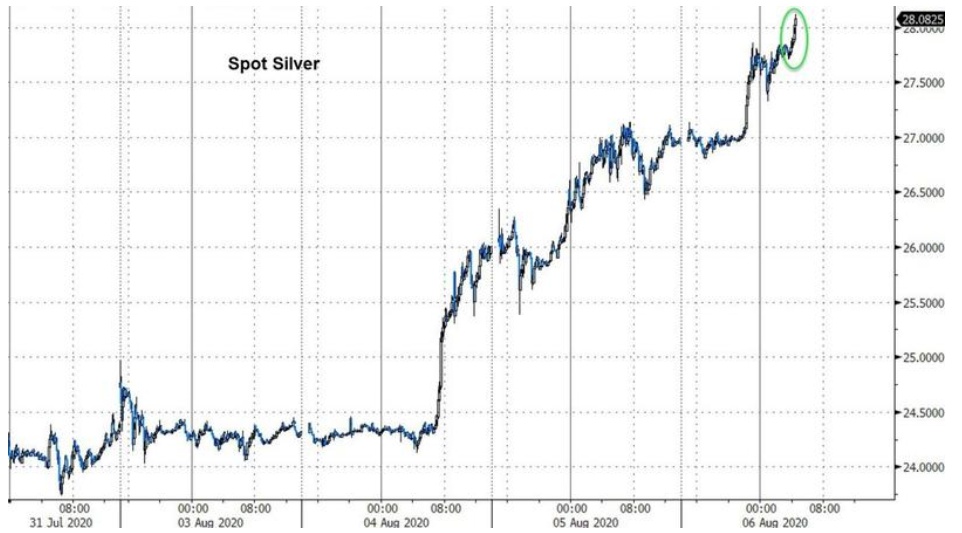 智通财经APP获悉,白银价格7月份上涨了25%,创下了白银有记录以来第二大月度涨幅,本周还在继续上涨,现货银价格周四(美东时间8月6日)早上突破了每盎司28美元。