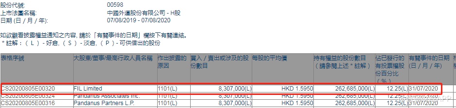 智通财经APP获悉,香港联交所最新资料显示,7月31日,FIL Limited增持中国外运(00598)830.7万股,每股作价1.595港元,总金额为1324.97万港元。智通财经APP获悉,增持后最新持股数目约为2.63亿股,最新持股比例为12.25%。