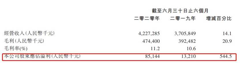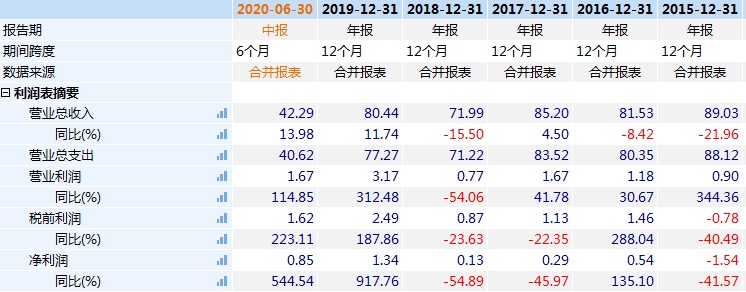 据半年报显示,截止2020年6月30日,该公司实现经营收入约人民币42.27亿元,同比增14.1%;公司股东应占溢利8514.4万元,同比增544.5%;每股基本盈利0.084元,不派息。其在财报中表示,业绩大涨主要还是因2020年上半年各事业均取得不错业绩表现。