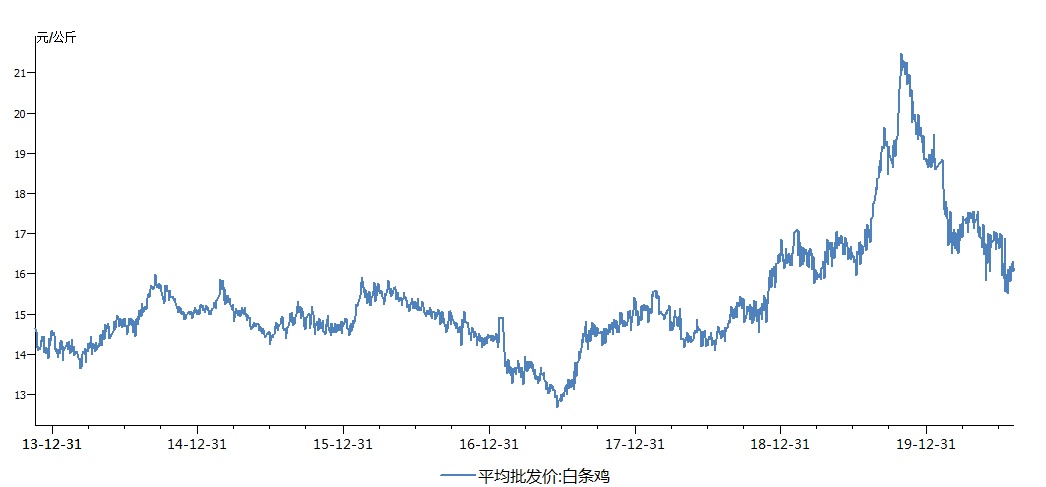 2019年,受非洲猪瘟影响,猪肉掀起疯狂涨价潮:农业农村部数据显示,2020年1月1日仔猪价格75.53元/公斤,较去年同期上涨236.6%。作为猪肉最佳动物蛋白替代品之一的鸡肉,价格也水涨船高——自2019年3月起,我国鸡类价格行情持续走高,截至2019年12月29日,白条鸡平均批发价为20.16元/公斤。