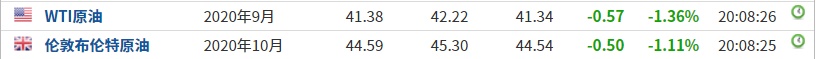截至发稿,WTI原油跌1.36%,报41.38美元/桶。布伦特原油跌1.11%,报44.59美元/桶。