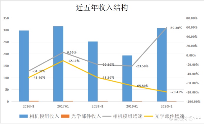 具体来看,相机模组一直以来均为公司最主要的收入来源,收入占比几乎均维持在98%以上。因此,此次公司收入的大幅增长,主要受到了相机模组销售的推动。截至2020年上半年,公司相机模组收入占比达到99.97%,实现同比增速59.3%。