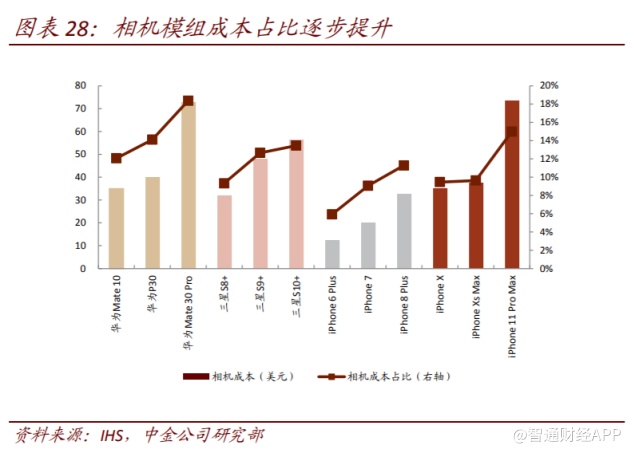 而据中金公司研报显示,随着手机更新换代,相机模组成本的占比呈现提升趋势。苹果作为高伟电子的主要客户,iPhone 11 Pro Max相机成本的占比较上一代有大幅提升,或成为公司相机模组业务增长的基础依据。
