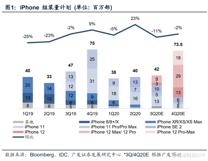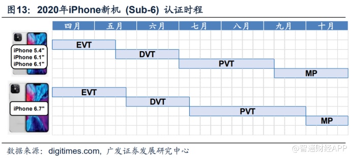 而展望下半年表现,广发证券对于iPhone全年出货上调预期,预估3、4季度iPhone组装量由4000万和7100万上调至了4200万和7350万部。其中,预期4款Sub-6机型分别8月底至9月底之间量产,4款毫米波机型于10月至11月之间量产,预期共8款iPhone12于年底前上市。