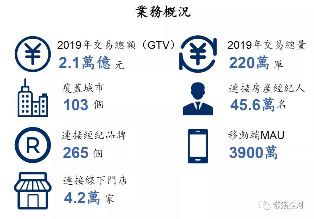 2.业务增长迅猛,2019年贝壳房产及租赁业务交易总额(GTV)达到2.1万亿人民币,总成交笔数220万单,从交易额和交易量来看,贝壳是国内最大的居住服务平台,2019年营业收入406亿人民币,年收入增长超60%,手机移动端更是月活超3900万。