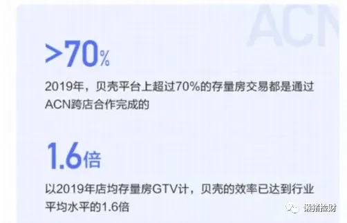 4.独创ACN(经纪人合伙网络)是连接不同品牌、经纪人的底层系统,提升房产交易作业的效率,使得贝壳的效率达到行业平均水平的1.6倍。