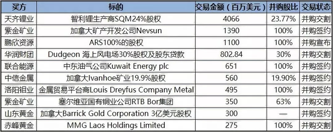 2018年,天齐锂业以40亿美元收购全球第二大锂业生产商SQM,紫金矿业又以13.9亿美元收购加拿大Nevsun矿业公司,鹏欣资源11亿美元并购ARS公司100%股权。