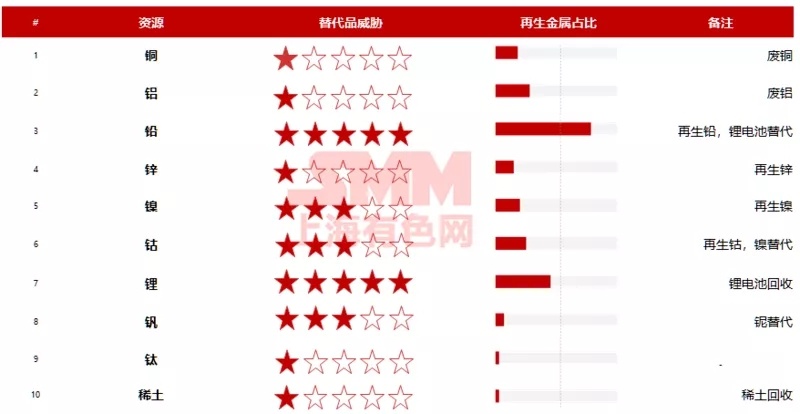 传统矿业进入难度相对较小,战略小金属矿业有一定的技术或政策门槛,未来对于原生矿业的替代主要来自于再生金属的冲击。铜、铝、镍仍被认为是投资机会最大的有色矿产,钴、锂新兴金属被认为是机会与风险并存的有色矿产,而铅、锌、钒、钛、稀土等投资机会较小。