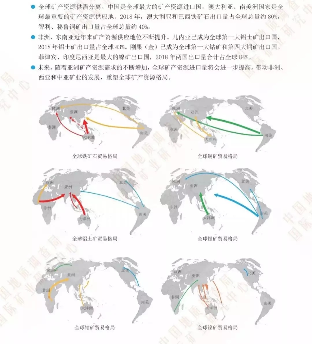 澳大利亚、南美洲地区是全球最重要的矿产资源供应地,随着亚洲矿产资源需求的不断增加,非洲、东南亚等国家和地区逐步成为重要矿产资源供应地区,几内亚已成为全球第一大铝土矿出口国,刚果(金)成为全球第一大钴矿和第四大铜矿出口国,菲律宾、印度尼西亚成为最大镍矿出口国。