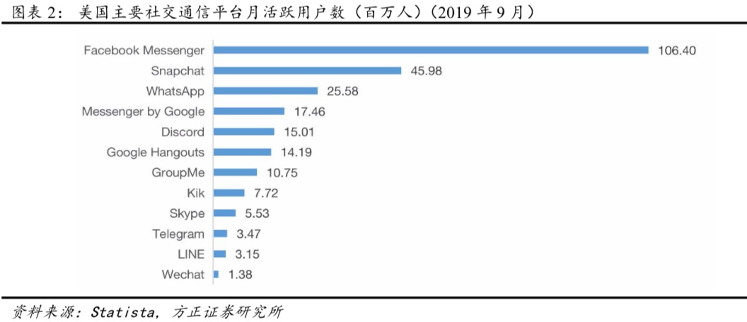 1、截至2019年9月Wechat在美国地区MAU仅138万,位居美国社交通信平台TOP12,仅占微信全球用户的0.1%,此次行政命令对微信整体业务影响有限。