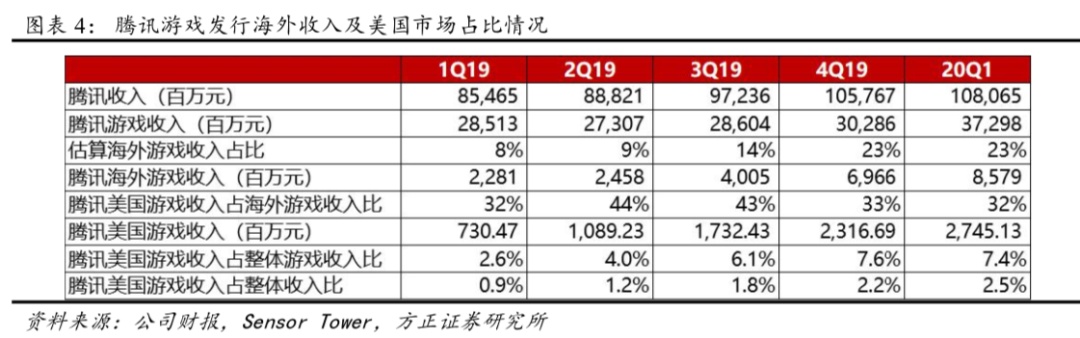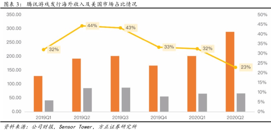 根据腾讯财报,19Q3、19Q4腾讯海外游戏收入占整体游戏收入比重约为10%+、23%,我们估计腾讯19Q1-20Q1季度海外游戏收入占整体游戏收入比分别为8%/9%/14%/23%/23%。根据Sensor Tower的数据,19Q1-20Q1季度腾讯游戏美国发行收入占海外发行收入比分别为32%/44%/43%/33%/23%,可测算出腾讯游戏美国发行收入占整体游戏收入比为2.6%/4.0%/6.1%/7.6%/7.4%。19年腾讯游戏美国发行收入共计58.69亿,占腾讯整体游戏收入比仅为5%,占腾讯整体收入比重不足2%,即使涉及腾讯在美国游戏发行业务,影响也较为可控。除此以外,目前腾讯出海收入主要来自《PUBG MOBILE》和《使命召唤手游》等,而《使命召唤手游》在美国的代理商为本土企业动视暴雪,受影响概率较小。